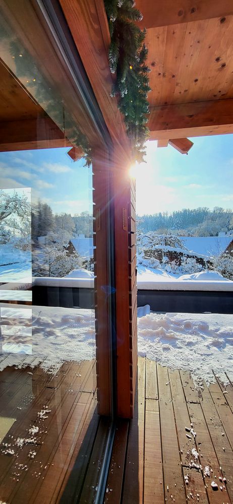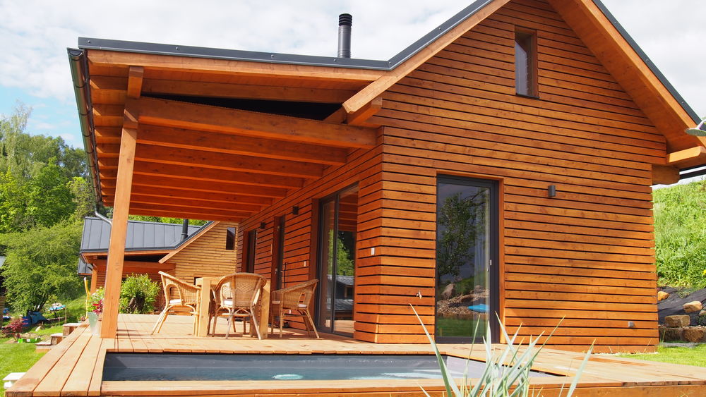 Do bazénu se slanou vodou můžete skočit přímo z terasy chaty. Užijte si dokonalé letní osvěžení!